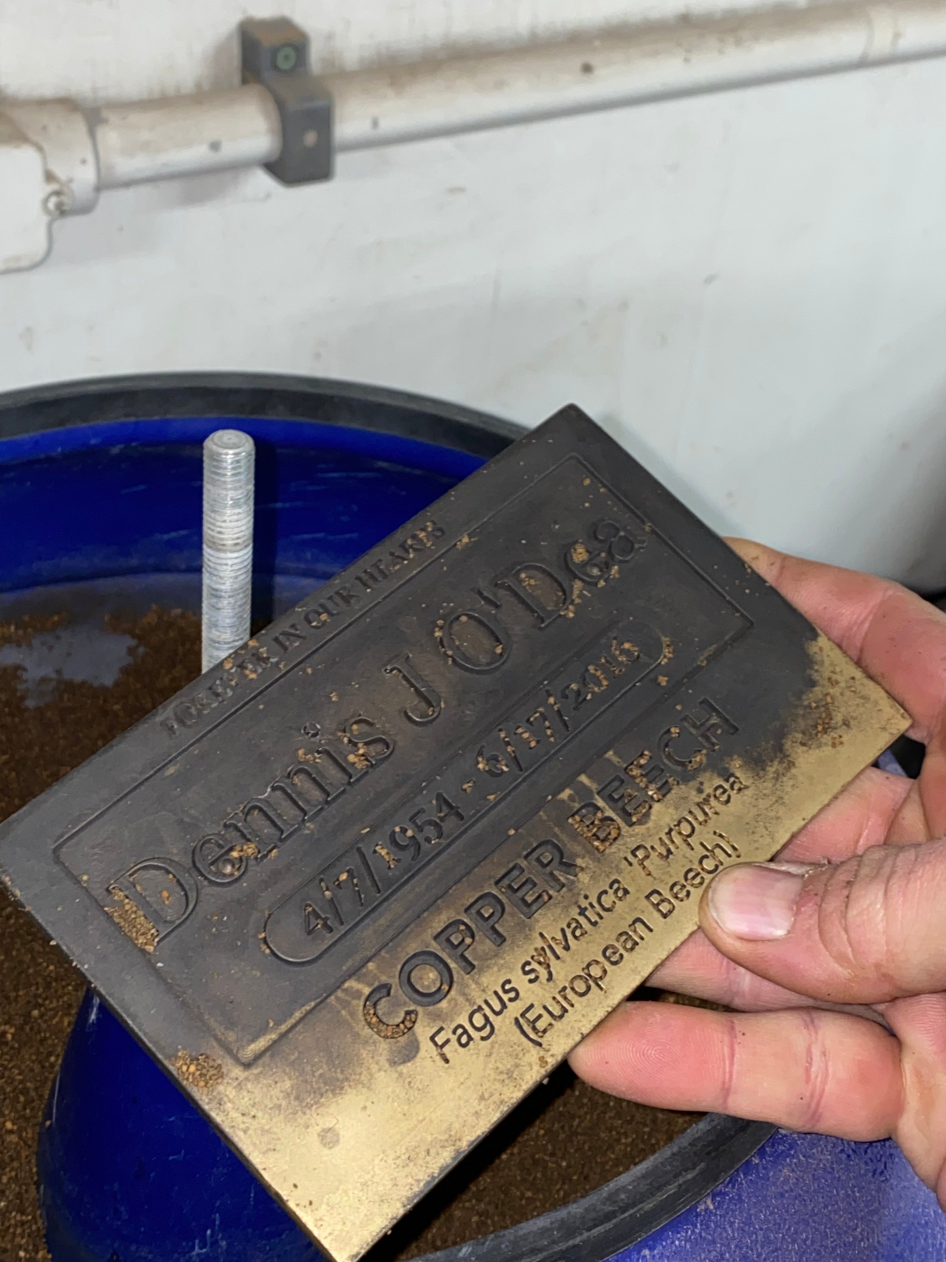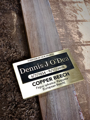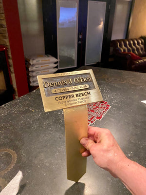 The Heirloom Collection Memorial Tree Marker is a plaque machined out of solid 360 Alloy Brass that is meant to memorialize a loved one and mark tree that was planted in their memory. It was designed to last for generations when left outside, with an equally rust-proof solid brass ground stake which is brazed to the plaque itself. It is finished in a protective lacquer to maintain the bright finish from darkening and keep the contrast of the lettering. It could eventually be dipped in lacquer thinner, cleaned and repolished or left to patina on its own. The Heirloom Memorial Tree Marker will outlive you and likely any tree you mark with it.
