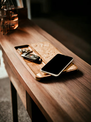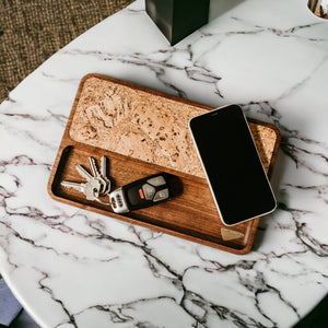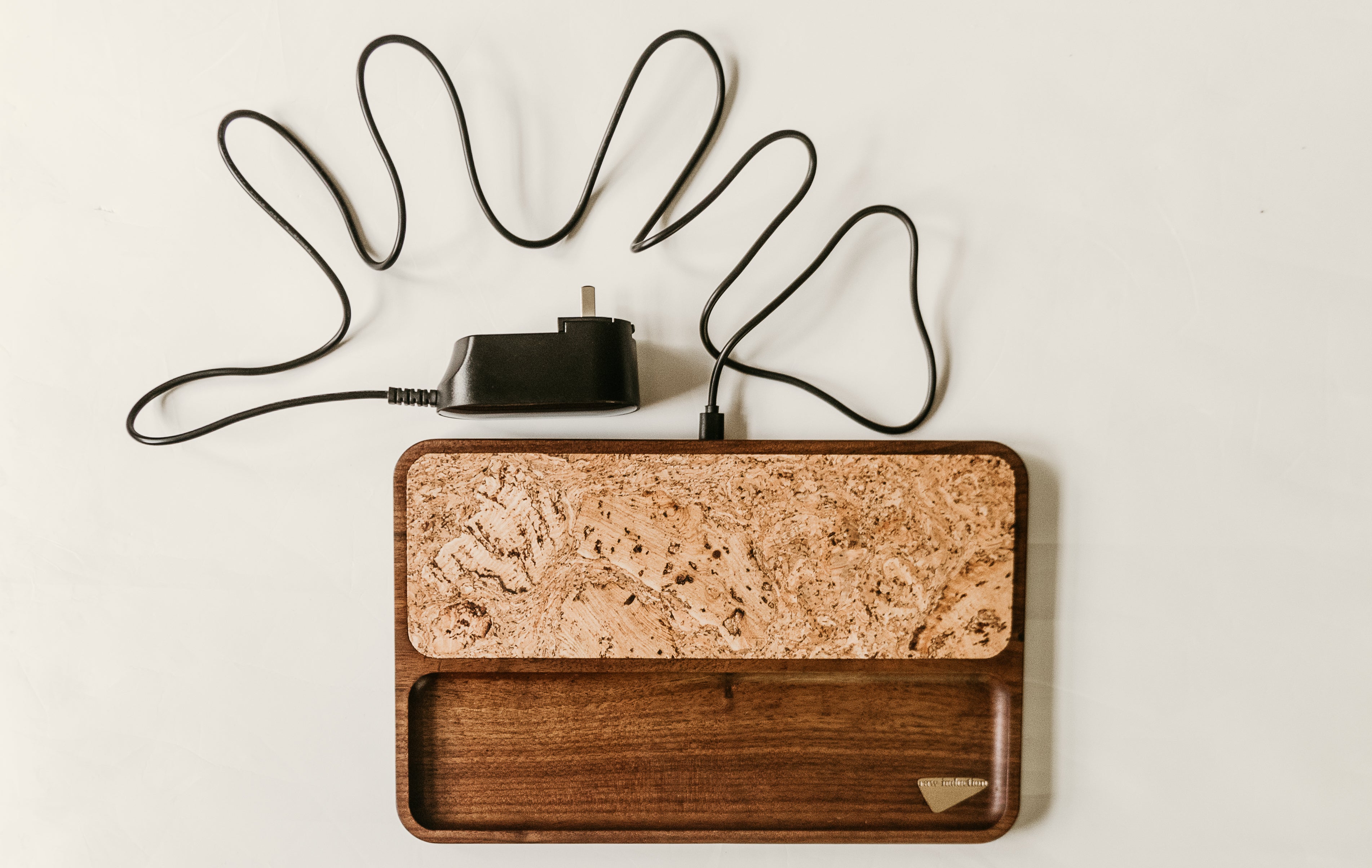 This beautiful catchall tray features a 9 coil Qi wireless charger which can fast charge up to 3 devices simultaneously at up to 10w each. The most popular version of our Catchall Charger is crafted out of milled Northeastern Pennsylvania Walnut and natural Portuguese Cork Oak bark, but is also available in additional unique materials and finishes below and is available through our Bespoke Studio in any combination of materials and colors you could dream of.