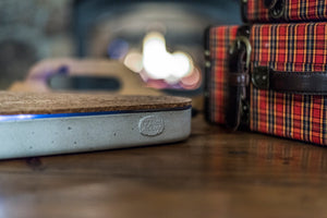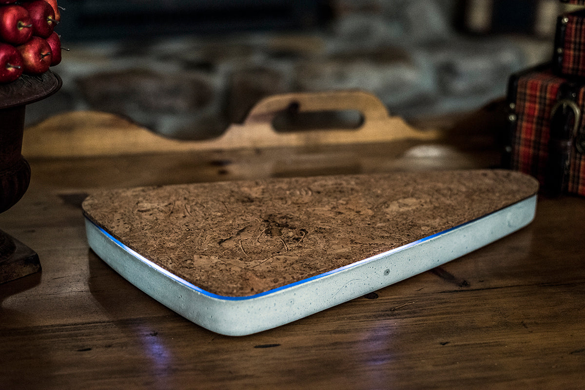 The Raw Induction Concrete Charger (aka: #ConcreteCharger) went viral when first announced and was years ahead of its time. It is a three device magnetic induction charger using free-roaming Qi standard hearts. It is handcrafted from a custom mix of high-strength concrete and topped with a soft, non-marring natural cork oak veneer imported from Portugal. It can simultaneously charge three mobile devices at 5w/1a.